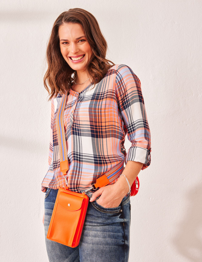 • Äußeres Handyfach mit Lasche und Druckknopf: Maße: 18 x 9,5 cm