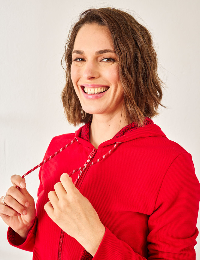• Mit kontrastgemustertem Jersey gefütterte Kapuze
