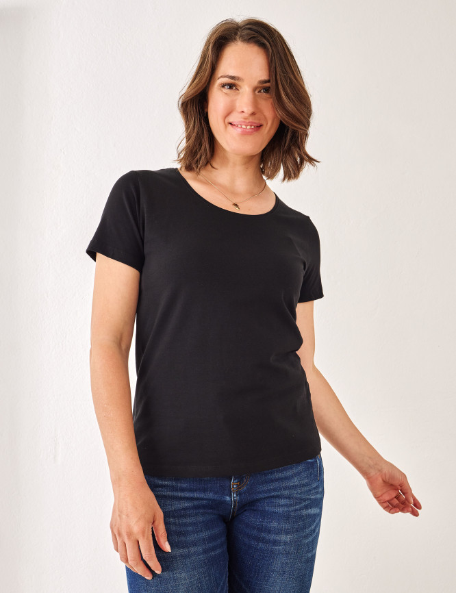 - Mit rundem Ausschnitt und kurzen Ärmeln