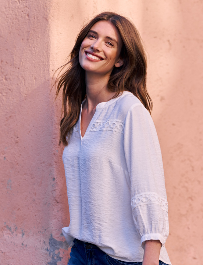 - Runder Ausschnitt im Henley-Style und 3/4 lange Ärmel