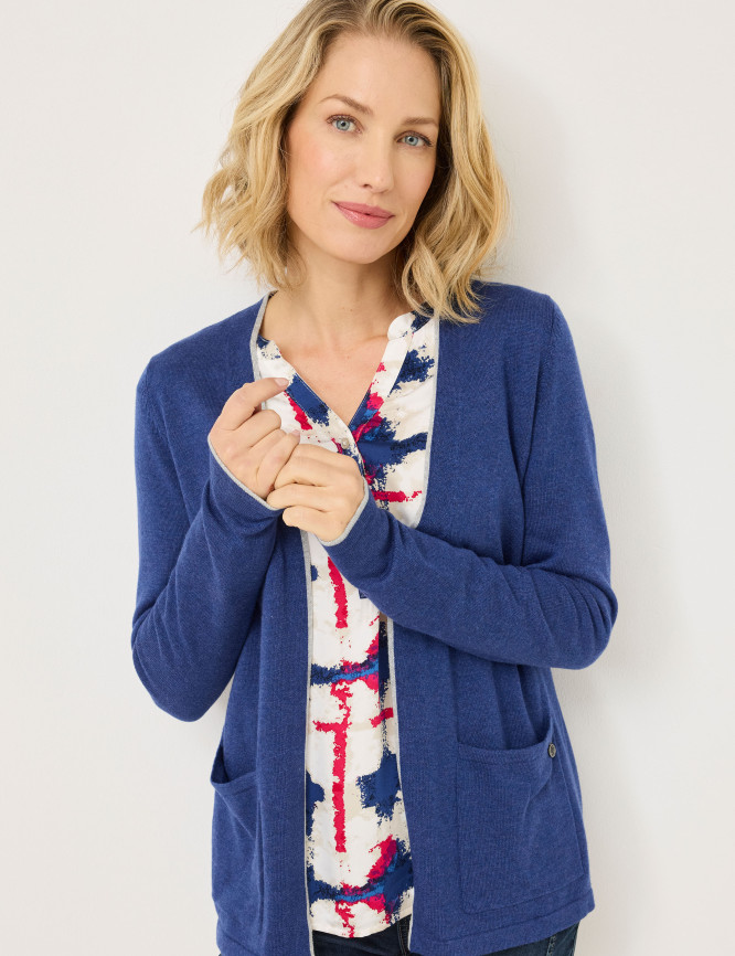 - Pflegeleichter Feinstrick mit kontrastfarbener Kante
