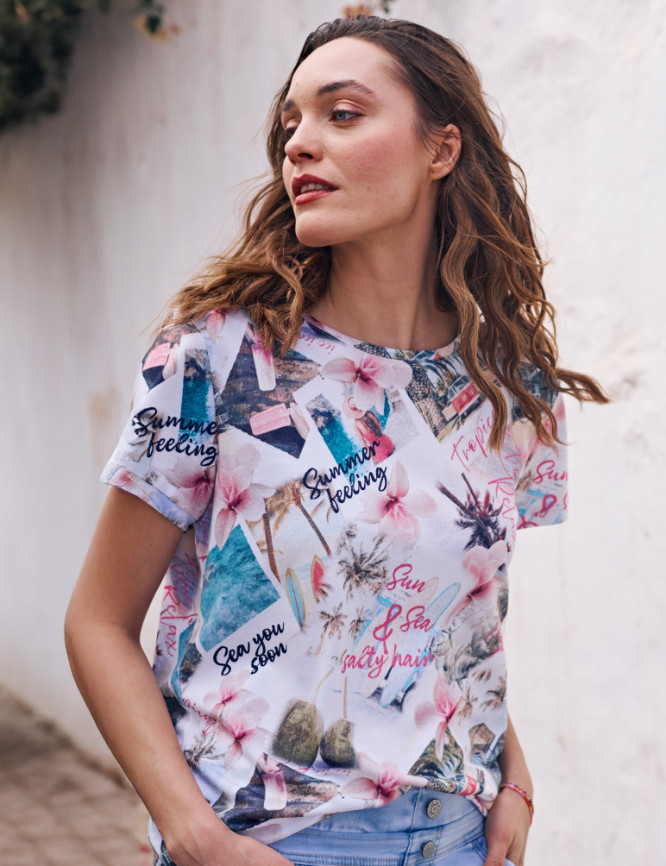 - Bequemer, runder Halsausschnitt mit effektvollem Print, der Sommerlaune macht